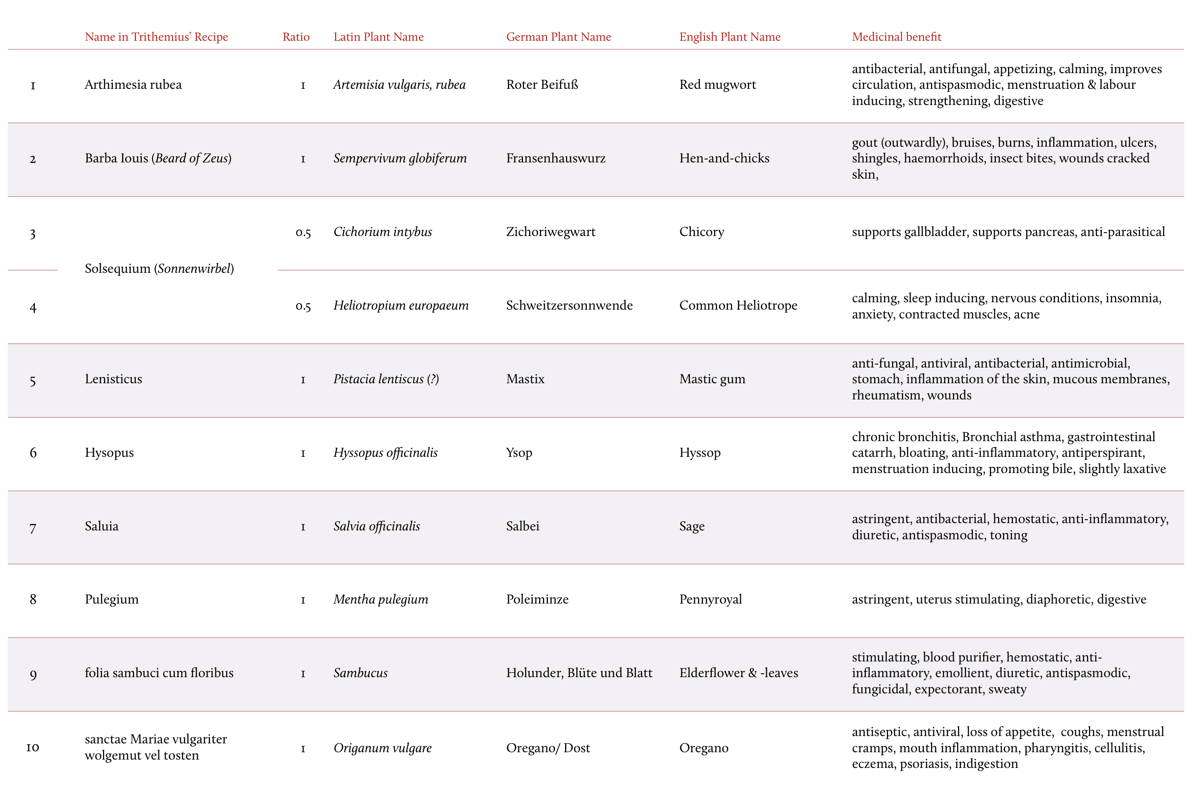 Trithemius had been an avid reader of the works of Hildegard of Bingen. While we leave it to the reader, to delve deeper into the magical herbal lore related to each of these potent plants, the many medicinal benefits of the powder are immediately obvious. It is also clear that it was possible to use the mixture of all these pulverised herbs both inwardly as well as outwardly - as no indigestible or poisonous substances are part of the formula.